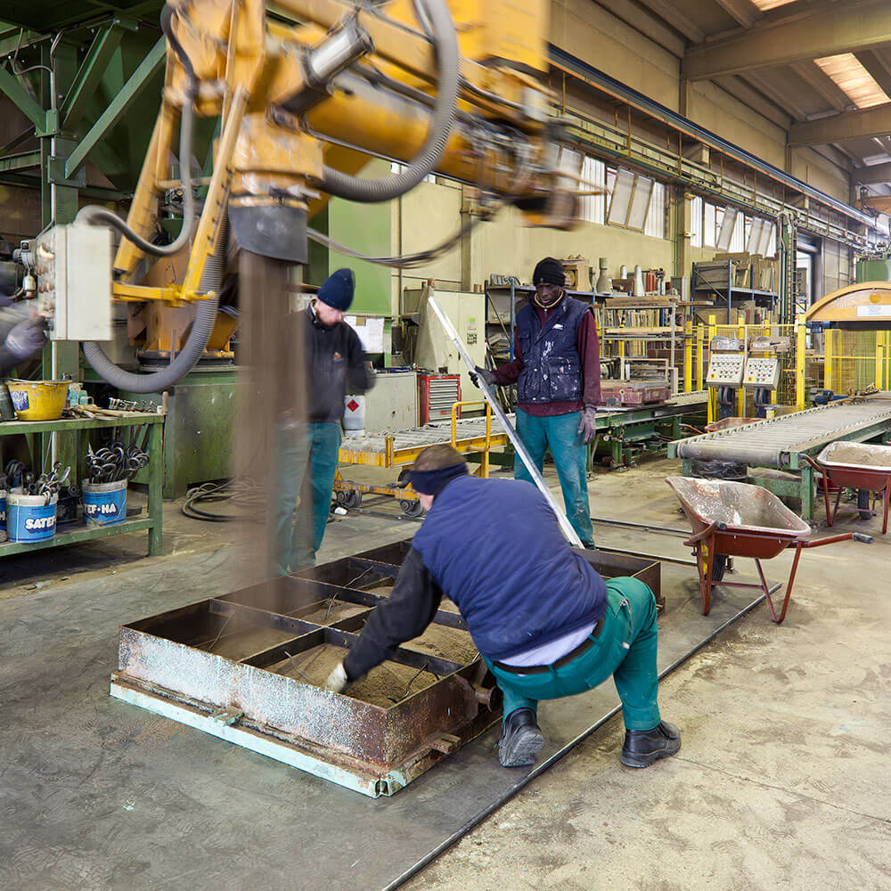 Après la coulée, une fois le processus de refroidissement terminé, on passe à l'opération de décochage : les pièces coulées sont positionnées sur un plan de travail où, grâce à des vibrations appropriées, le sable est séparé de la pièce ; ce dernier passe à la phase de finition.